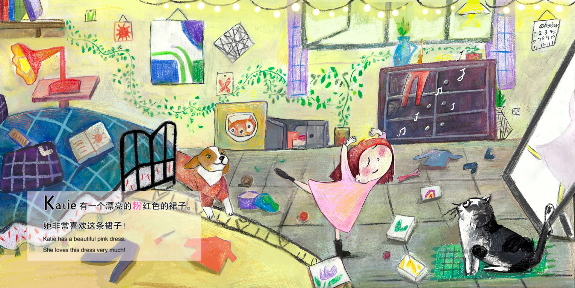 Katie loves her pink dress and dances with joy at home.