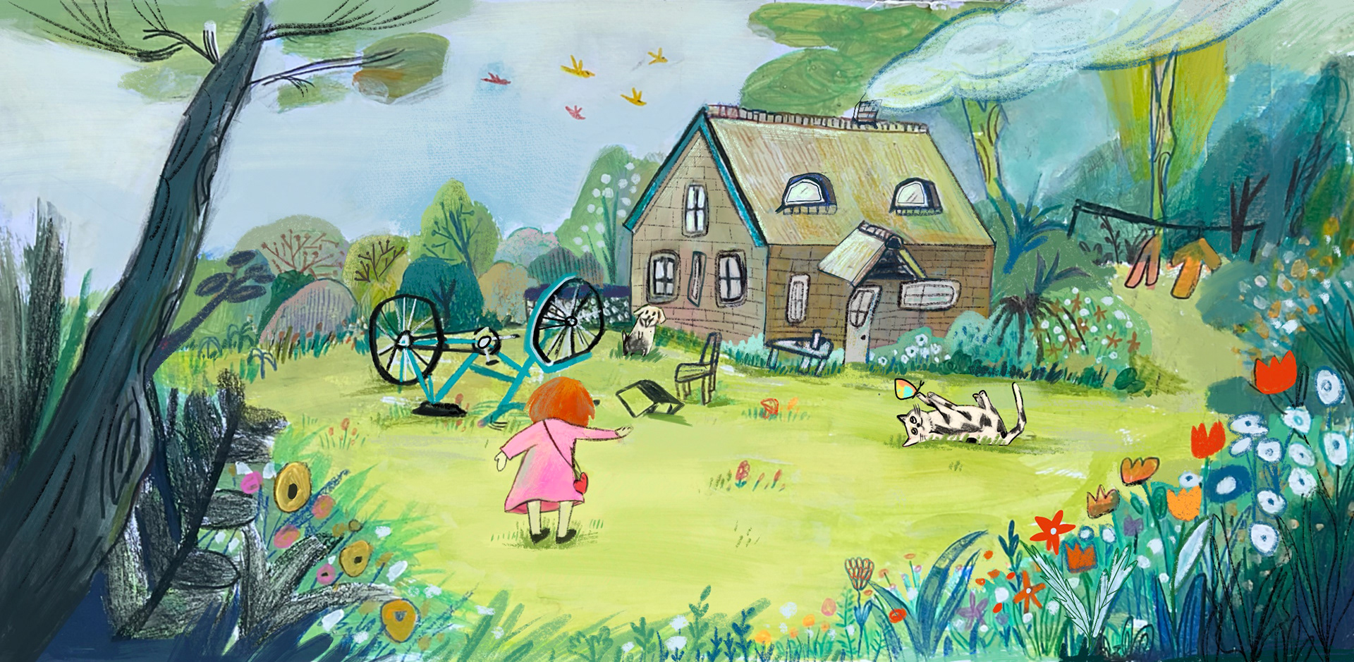 Katie plays in the garden, exploring nature with her cat.