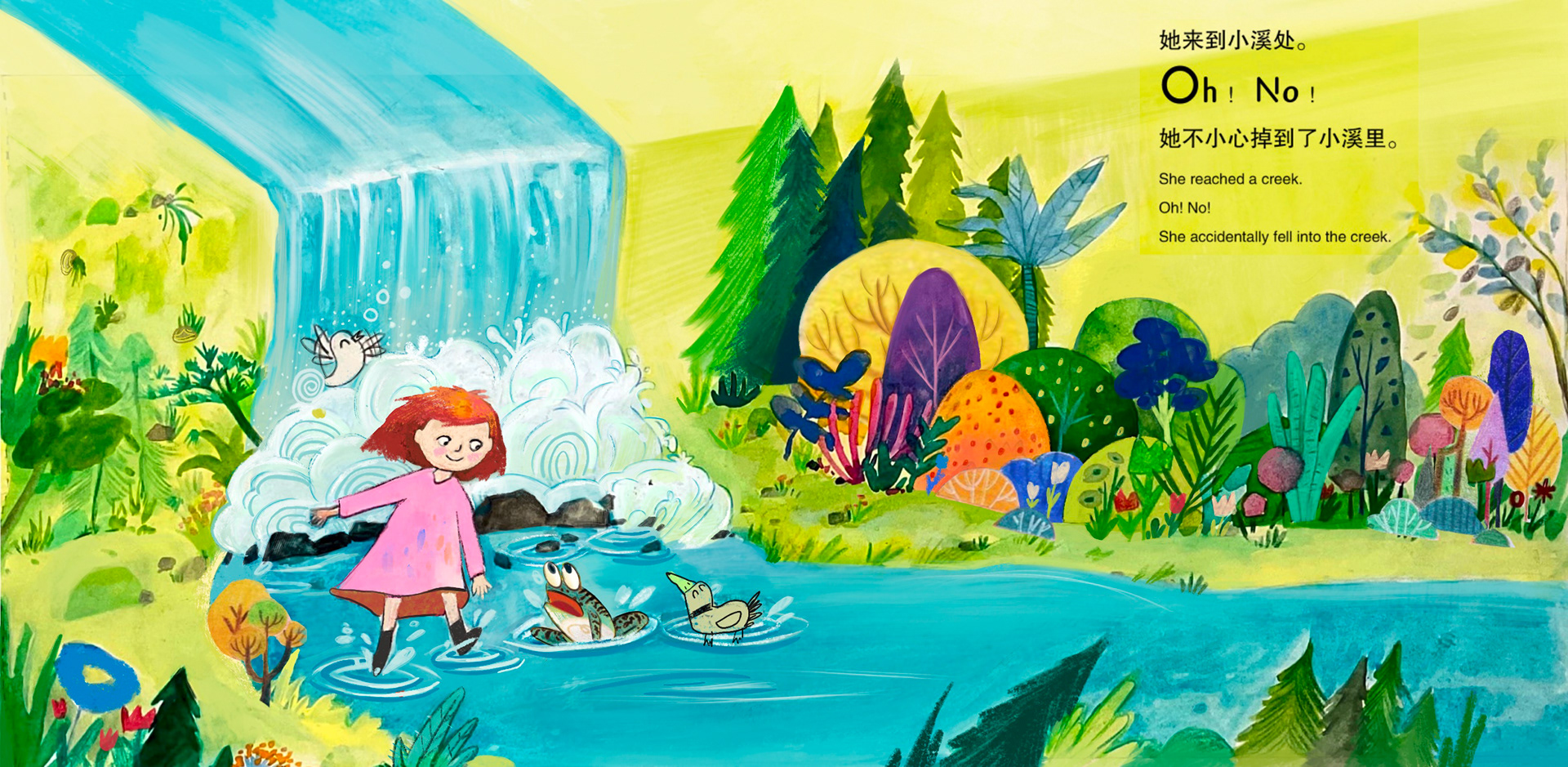 She slips and falls into the creek — but still smiles.