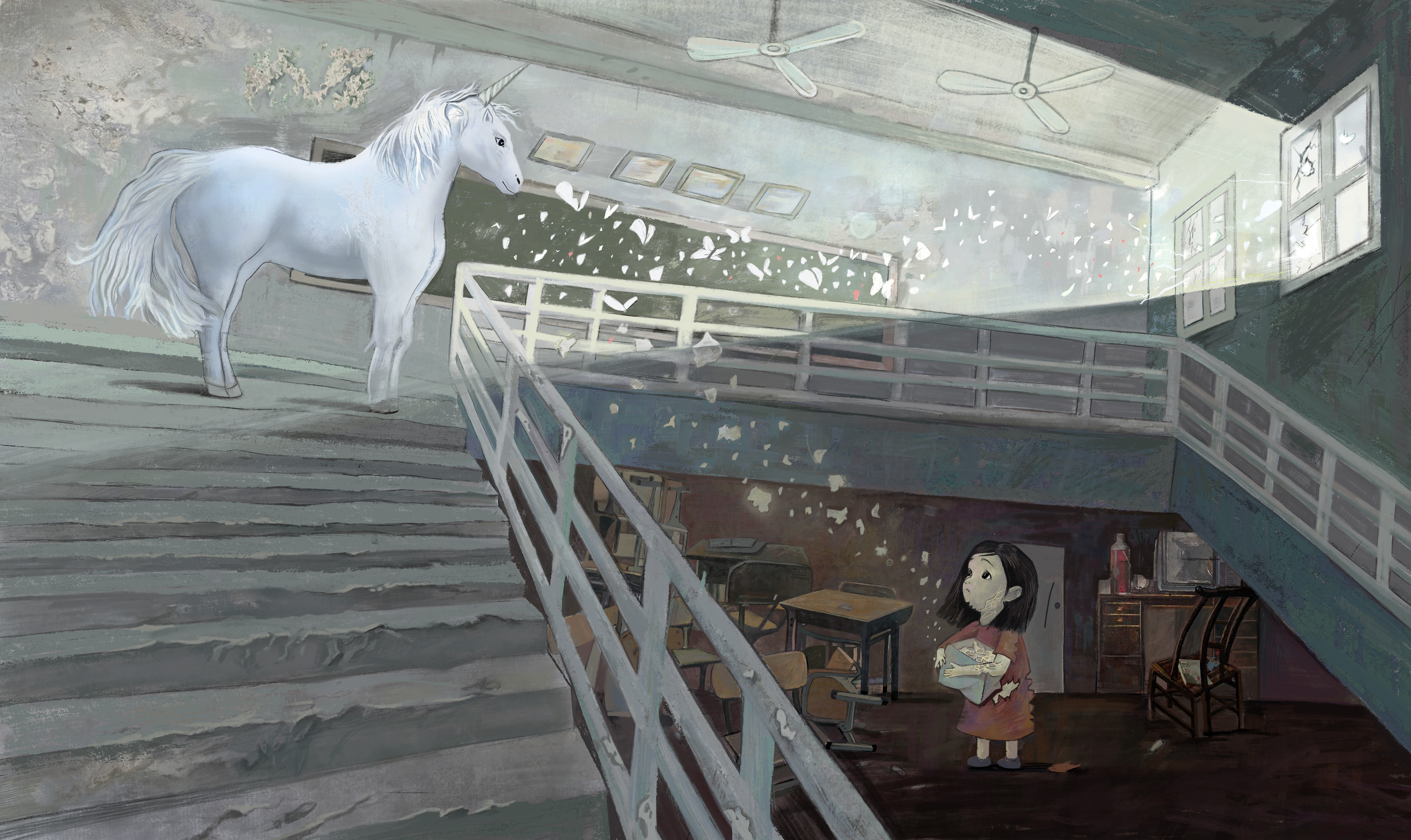 Unicorn in Classroom – Fantasy intruding into a bleak setting.